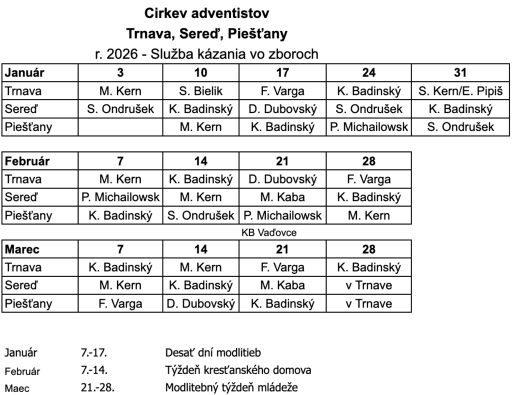 Rozpis kázní na 1. štvrťrok 2026